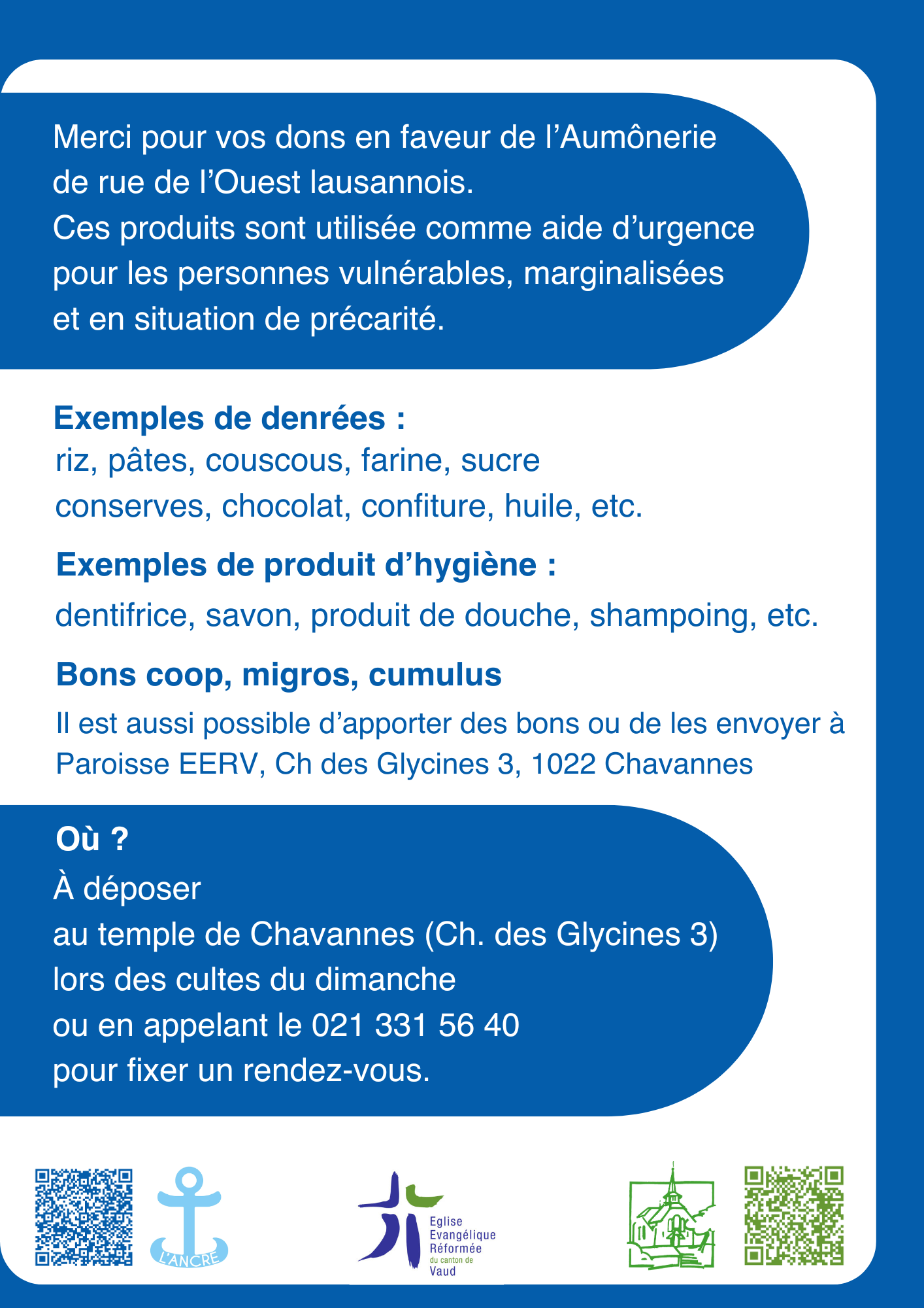 Du 1er février au 1er mars, vous pouvez déposer à l’église des produits de première nécessité non périssables (nourriture, hygiène) pour soutenir l’Aumônerie de rue à Chavannes. Ils sont soit redistribués comme aide d’urgence soit utilisés pour confectionner des repas. Dépôt possible le dimanche lors des cultes ou en appelant le 021 331 56 40.