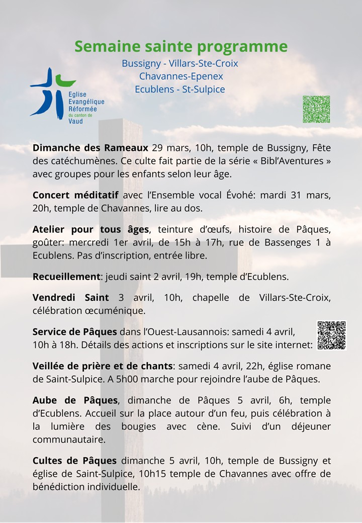 Les paroisses de notre trio, Bussigny – Villars–Sainte-Croix, Chavannes – Epenex et Ecublens – Saint-Sulpice présentent, des Rameaux à Pâques, des activités et des temps forts pour chaque jour de la Semaine sainte.