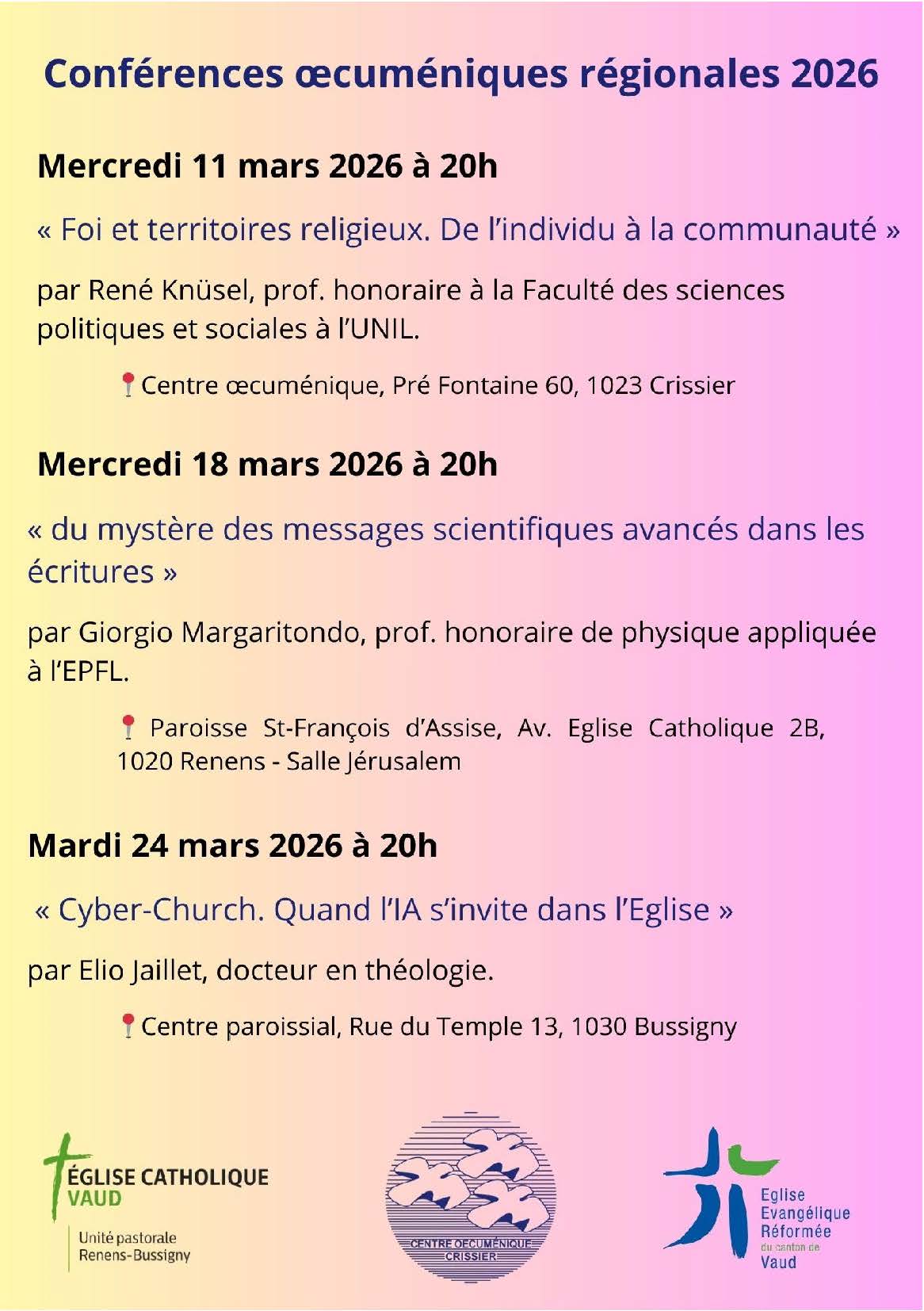 Dans un monde qui donne souvent le spectacle d’un individualisme triomphant, et y compris dans le domaine spirituel, les humains que nous sommes n’en auront jamais fini avec le besoin du vivre ensemble et de faire communauté. Ce sera le thème de la première rencontre le mercredi 11 mars 2026, 20h à Crissier, Centre œcuménique, quartier Pré-Fontaine 60 (entrée du jardin d’enfants, à côté de la pizzeria). Avec René Knüsel, professeur à la faculté de SSP de l’UniL.