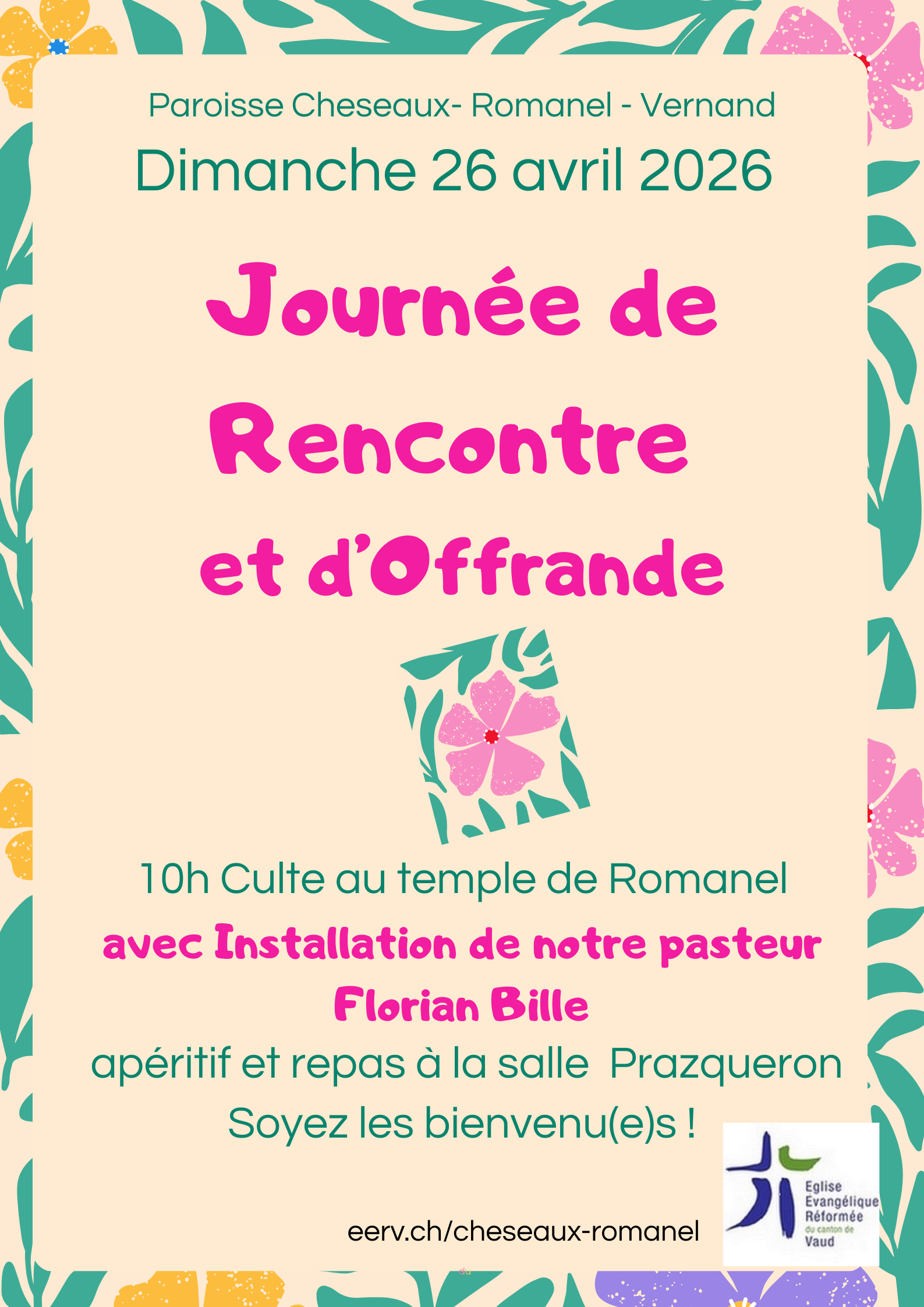 Dimanche 26 avril , culte à 10h au temple de Romanel, avec Installation de notre pasteur Florian Bille, suivi d'un apéritif et repas à la salle de Prazqueron