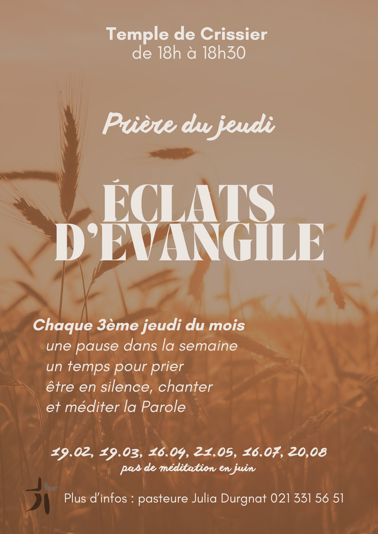 Venez prendre un temps de pause pour vous recueillir autour d'un texte biblique en écho à une oeuvre d'art, avec une liturgie simple, des temps de chant et de silence. Au Temple de Crissier, Chemin du Casard 2, les 19.02, 19.03, 16.04, 21.05, 16.07, 20.08. Pas de méditation en juin.