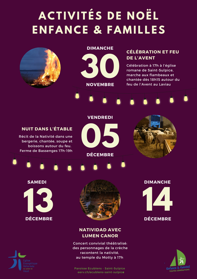 Des personnages de la crèche racontent la nativité: un spectacle pour petits et grands en musique et plein de poésie ! Bienvenue au temple d'Ecublens le samedi 13 et le dimanche 14 décembre à 17h.