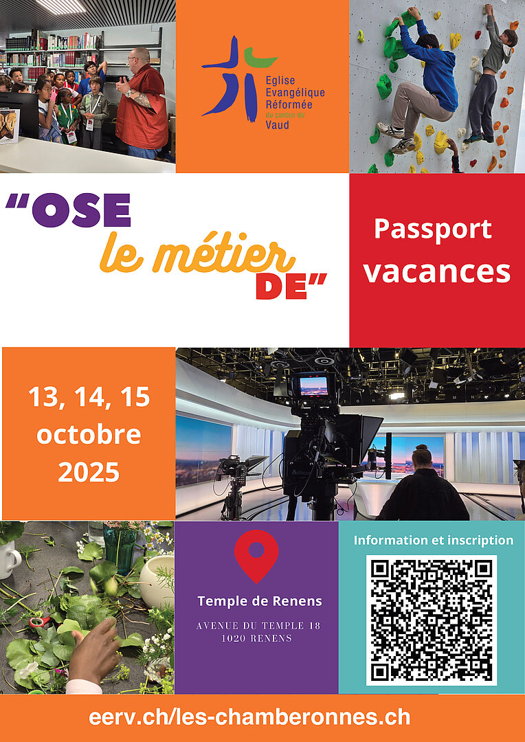 Publié le13-14-15 octobre: trois jours (9h-17h) ouverts à toutes et tous dès 8 ans, basés au temple de Renens. Au programme: découvertes de métiers (le monde de la scène, l'aventure du courrier, Commune et nature) et des temps spirituels pour chaque âge. On peut s'inscrire pour 1, 2 ou 3 journées et venir avec parents ou grands-parents. Chouette, non ? Et les prix sont doux, très doux !