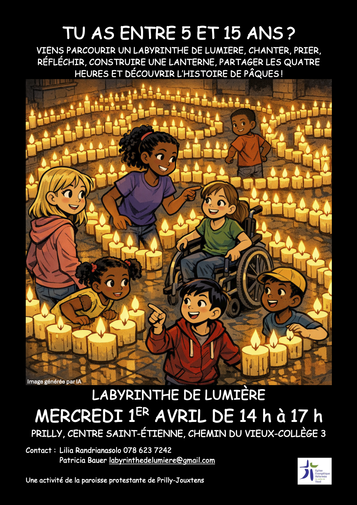 Il y a des labyrinthes où l’on se perd. Le nôtre est un labyrinthe où l’on se trouve. En 2026, pour la cinquième année consécutive, la paroisse protestante de Prilly-Jouxtens installera un labyrinthe de lumière au Centre Saint-Étienne à Prilly pendant la semaine de Pâques. C’est une expérience spirituelle immersive, un chemin de méditation à parcourir à son rythme (env. 20 min.), dans une pénombre éclairée par 250 bougies, dans un silence soutenu par une musique inspirante.
