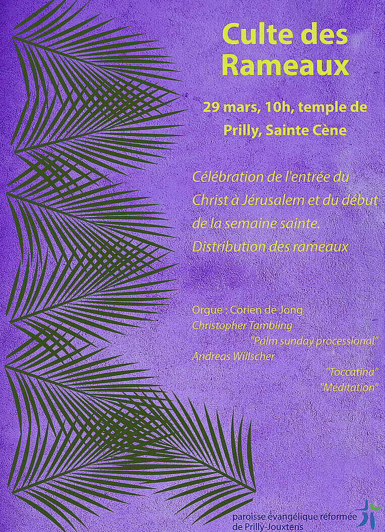 L’entrée à Jérusalem, dimanche des Rameaux, 29 mars, à 10h au temple de Prilly : nous célébrerons l’entrée du Christ à Jérusalem et le début de la semaine sainte. Avec distribution des rameaux.