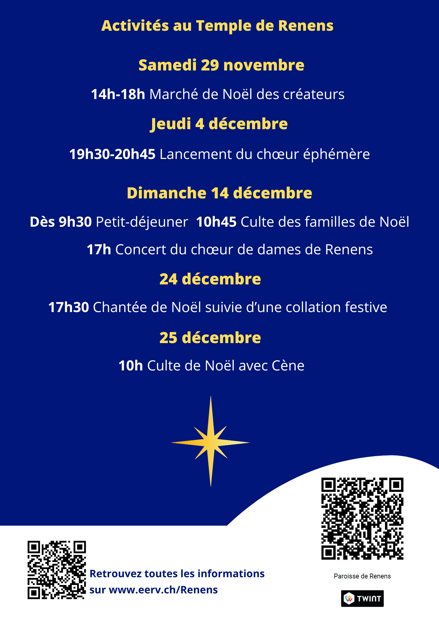 Jeudi 11 décembre, à 9h15 au temple de Renens, prière du jeudi avec temps de partage autour de l'Évangile de Marc, de prière, chants, musique. Suivi d'un café de Noël.
