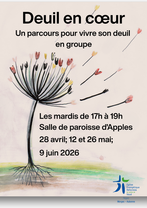 Dès fin avril, Samuel Ramuz et Corinne Curchod proposent un parcours pour vivre son deuil en groupe. Basé sur l’approche Jean Monbourquette, prêtre et psychologue québécois, le parcours offre un cadre bienveillant pour dire sa souffrance, travailler ses émotions, réajuster ses relations et, petit-à-petit, trouver un sens à sa perte.