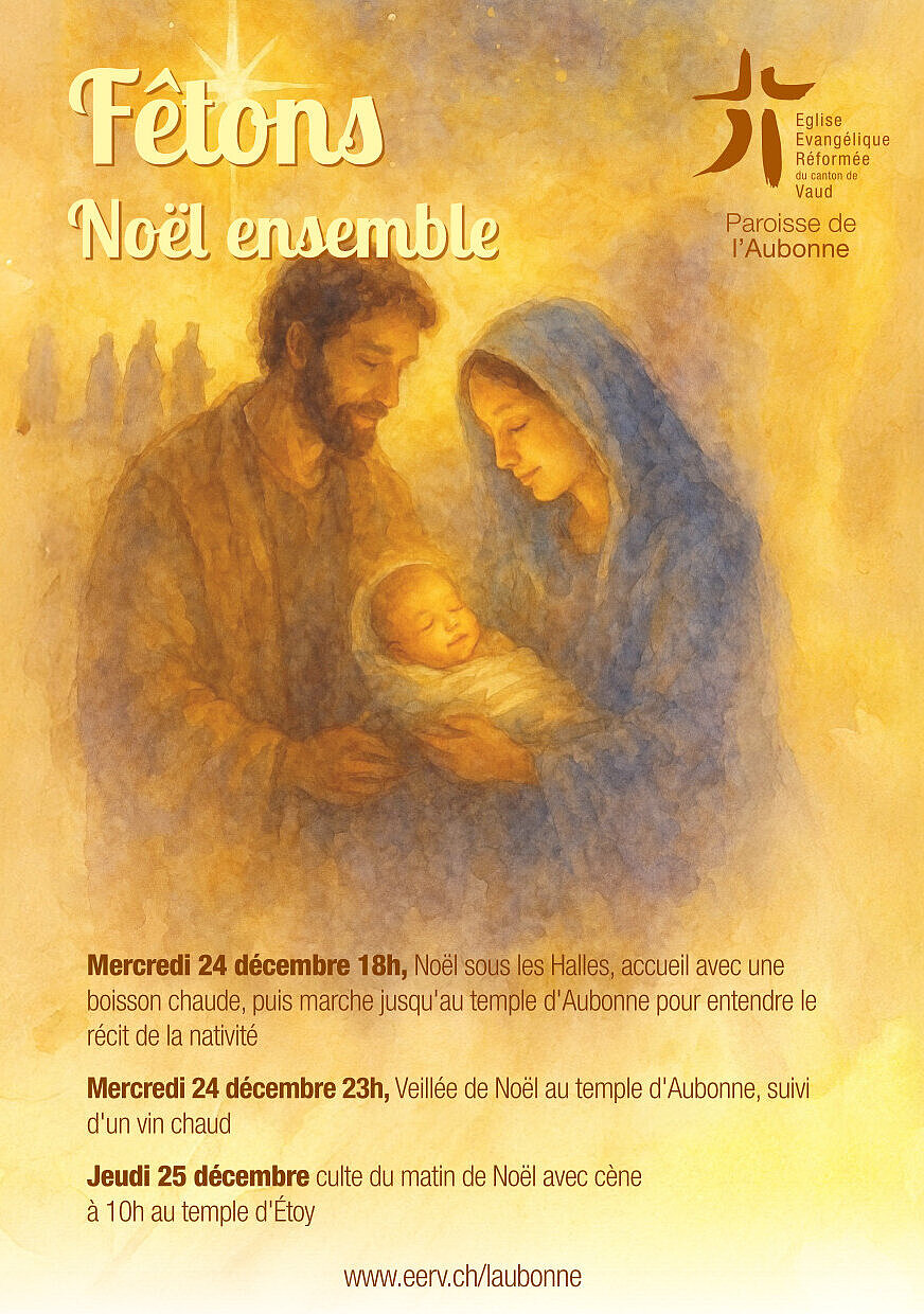 Mercredi 24 décembre 23h, Veillée de Noël au temple d'Aubonne, suivi d'un vin chaud.