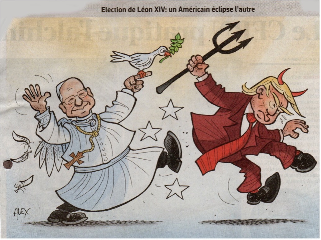L’Eglise ne peut pas rester muette et inactive, elle doit agir, et elle le fait déjà. Je ne résiste pas à vous montrer un dessin de presse d’Alex, caricaturiste au journal de la Liberté, lors de l’élection du pape Léon XIV.