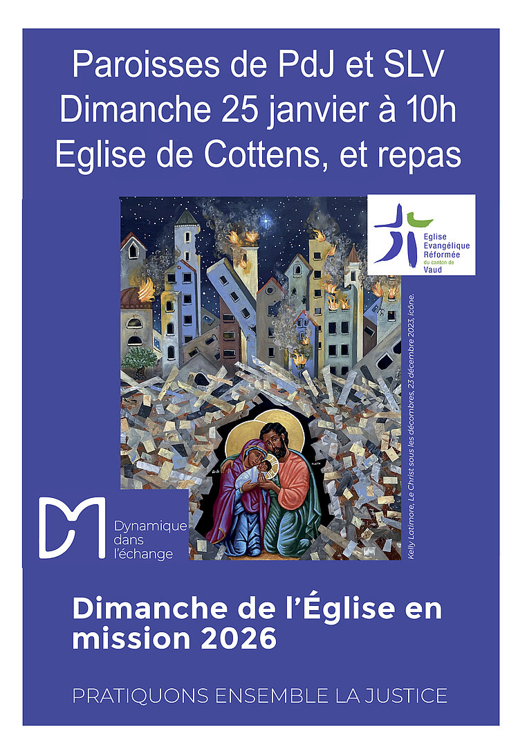 Un culte en commun le 25 janvier, à 10h au temples de Cottens avec la paroisse du Pied du Jura sur la thématique de la justice. Le culte sera suivi d'un repas à la grande salle préparé par le Pied du Jura, avec chapeau à la sortie. Une participation aux desserts est bienvenue !