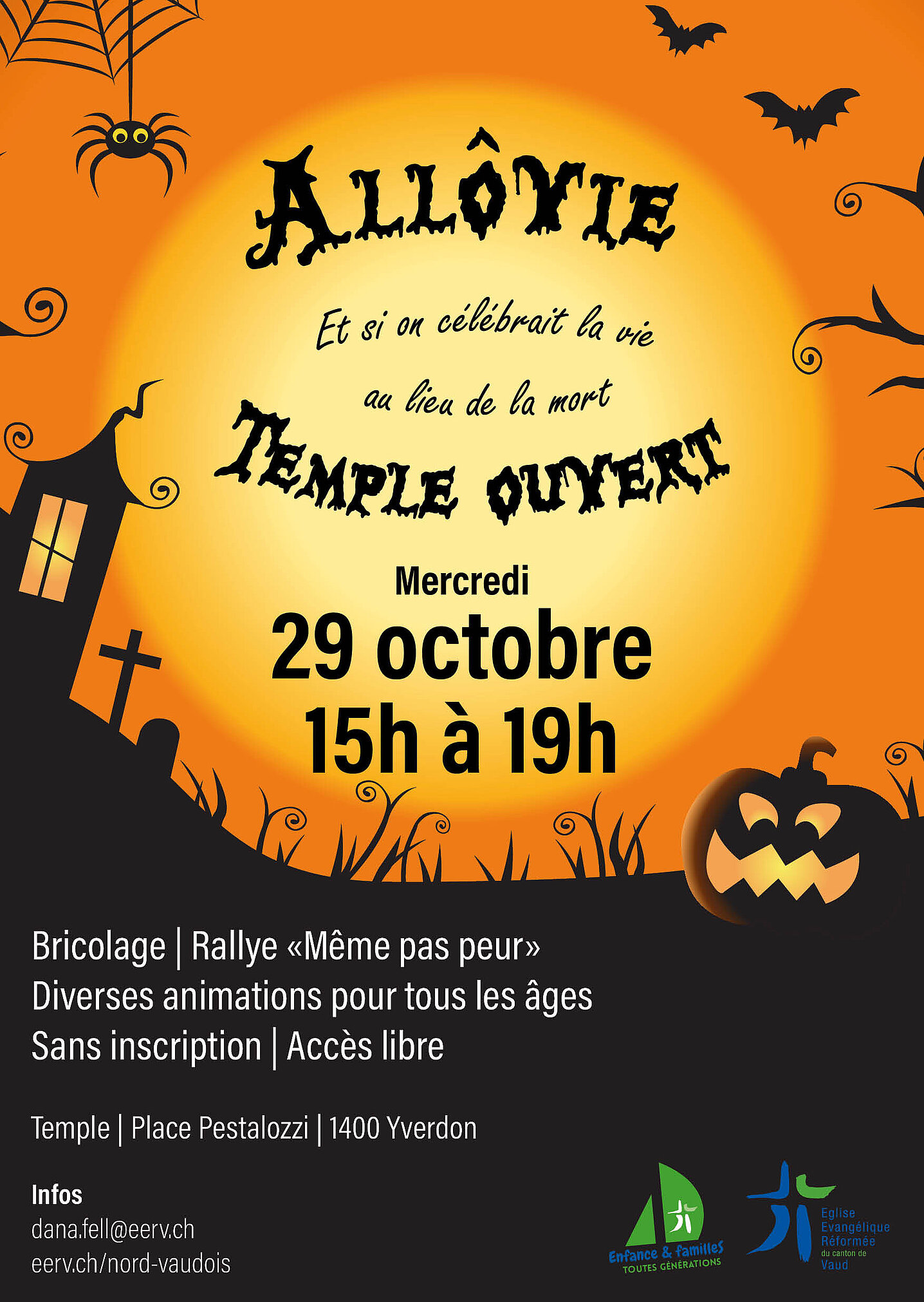 Le mercredi 29 octobre de 15h à 19h, rejoignez-nous au Temple d’Yverdon, Place Pestalozzi, pour une après-midi d’Halloween unique en son genre ! Plutôt que de célébrer la peur, nous vous invitons à vivre un moment festif et joyeux, plein d’activités créatives et familiales. Cet événement est pensé pour tous, des petits aux grands, dans une ambiance conviviale et accueillante.