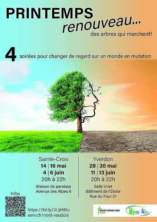 Pour les faire résonner dans une réflexion qui dépasse toute approche partisane (politique, économique ou religieuse), nous proposons ensemble, réformés et catholique de la Région du Nord vaudois, quatre rencontres sous le titre « Printemps, renouveau… des arbres qui marchent », les 28 et 30 mai, 11 et 13 juin (2 mardis et 2 jeudis), de 20h à 22h, à la salle Viret du Bâtiment de l’Etoile, rue du Four 21, à Yverdon-les-Bains (à 5 min. à pied de la gare). Un même cycle de rencontres est organisé à Sainte-Croix les 14 et 16 mai et les 4 et 6 juin.