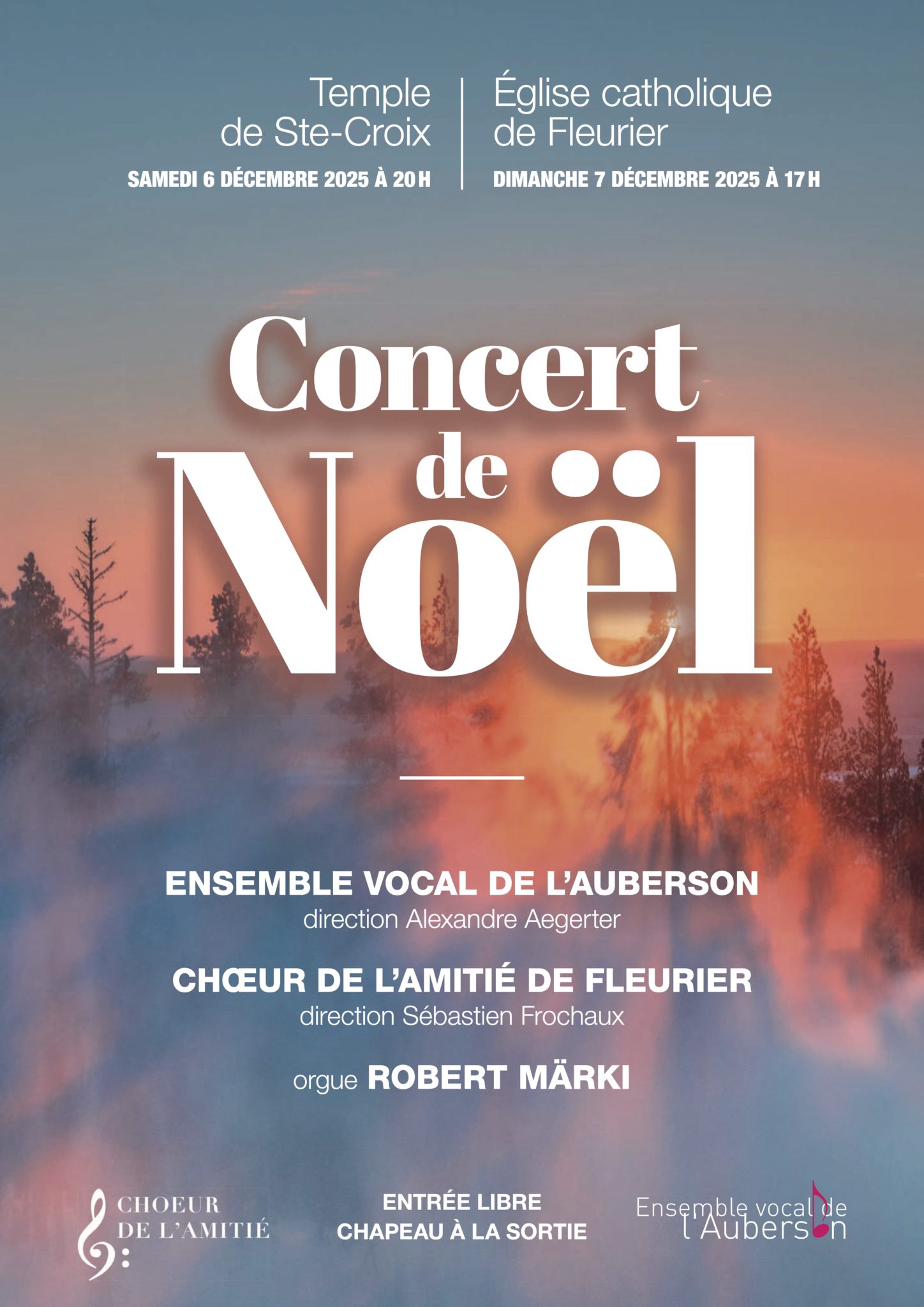 Samedi 6 décembre à 20h au temple de Sainte-Croix et dimanche 7 décembre à 17h à l'église catholique de Fleurier, l'Ensemble Vocal de l'Auberson et le Choeur de l'Amitié à Fleurier vous invitent à leurs concerts de Noël.