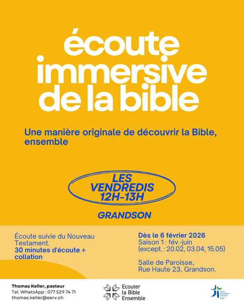 La paroisse de Grandson propose une écoute immersive de la Bible, une expérience originale centrée sur l’écoute audio du Nouveau Testament, vécue en groupe, dans un cadre accueillant et sans prérequis.