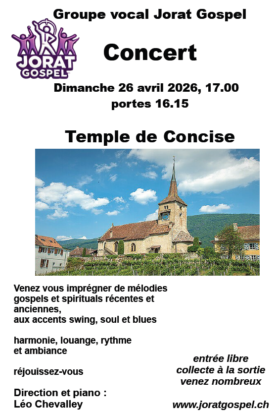 Concert du Groupe vocal Jorat Gospel, le 26 avril à 17h à l'église de Concise.