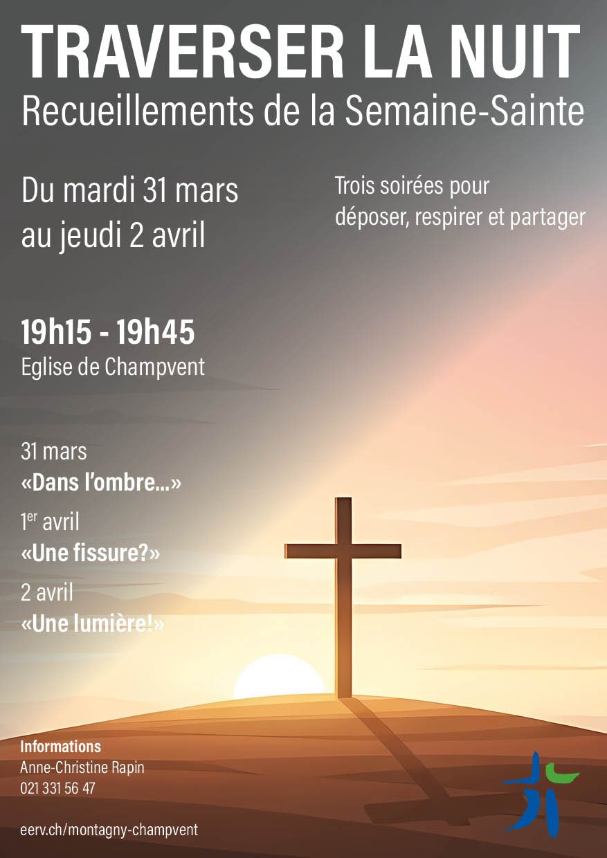 Durant la Semaine-Sainte, du mardi au Jeudi-Saint, trois courts recueillements sont proposés à l'église de Champvent, de 19h15 à 19h45, celui du Jeudi-Saint comprenant une Sainte-Cène.