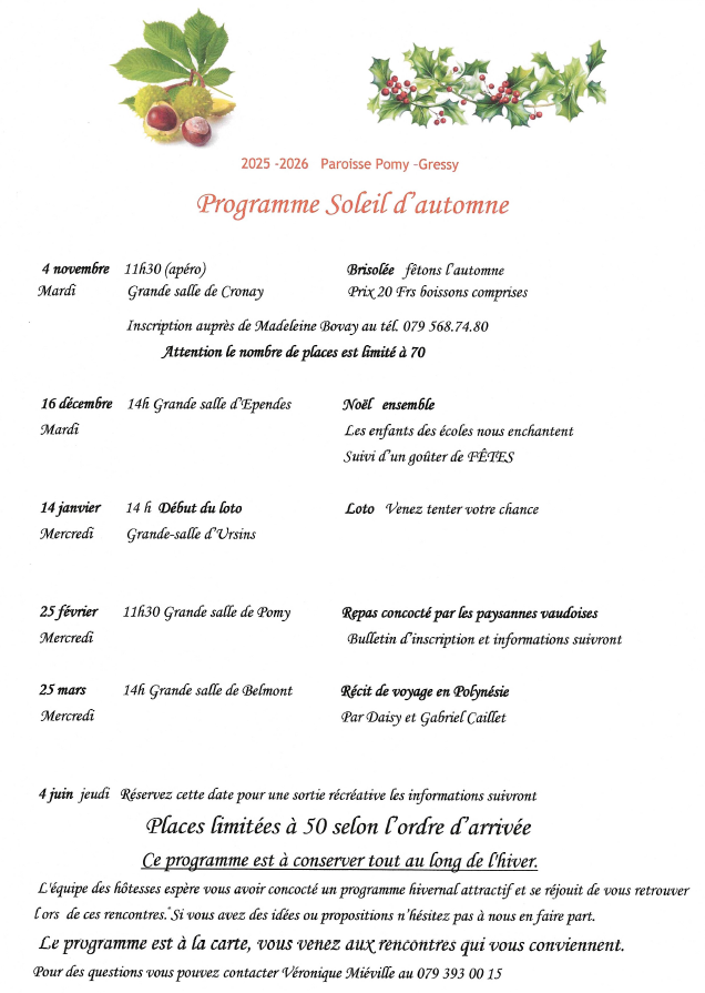 Le groupe Soleil d'automne de Gressy, Suchy, Ependes, Pomy et environs est dédié aux personnes de 65 ans et plus.