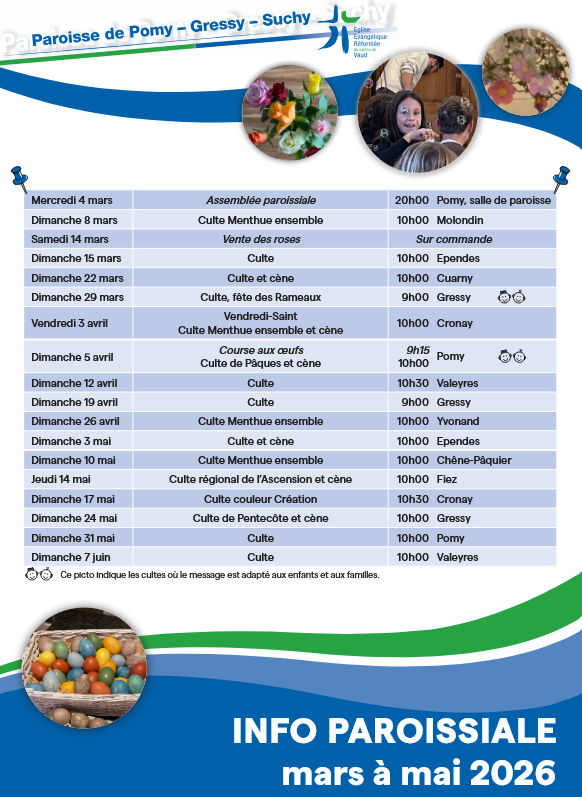 Retrouvez les horaires des cultes et les évènements de notre paroisse dans l'info paroissiale de mars à mai 2026.