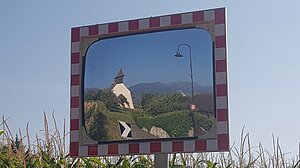 Dans ce miroir, l’église de Montagny-près-Yverdon est déformée.