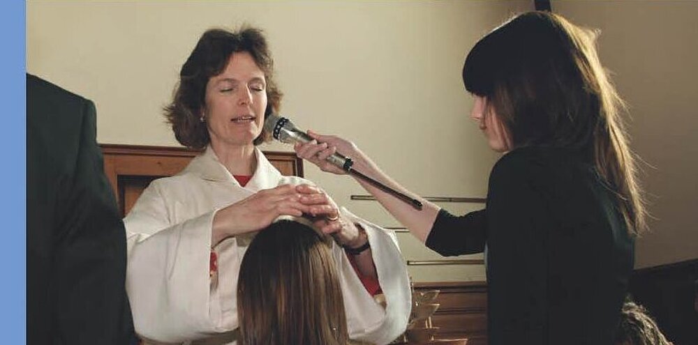 - geste de baptême, avec de l’eau, au nom du Père, du Fils et du Saint-Esprit, puis bénédiction;