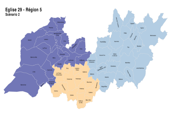 Pour le secteur Venoge, 2 scénarios étaient envisagés: un scénario à une seule paroisse avec les paroisses de La Sarraz, Veyron-Venoge, Cossonay, Penthalaz et Vufflens-la-Ville et un second scénario à 2 paroisses.
