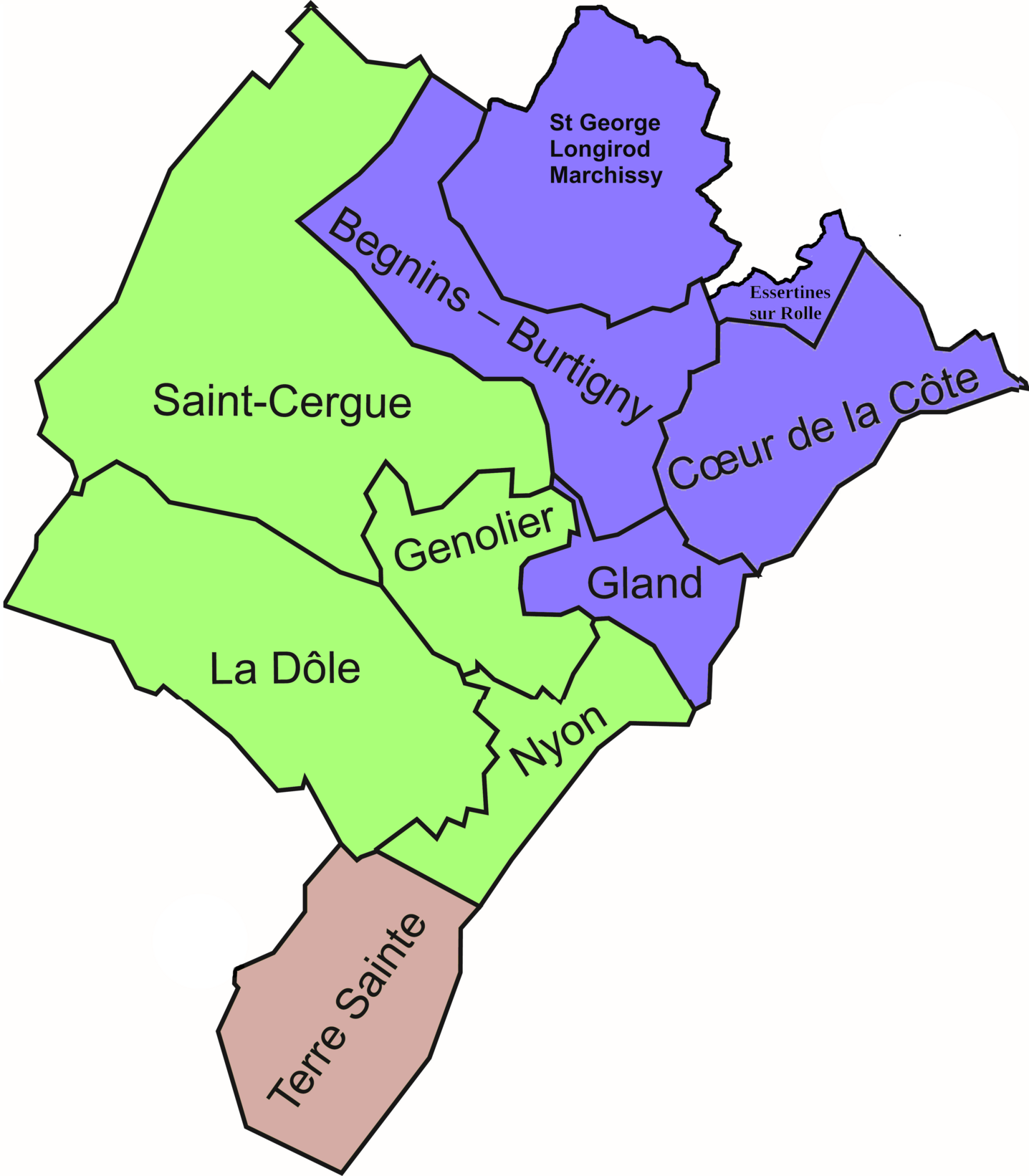 La paroisse de l'Ouest se composerait des paroisses actuelles de Saint-Cergue, Genolier, La Dôle et Nyon.
