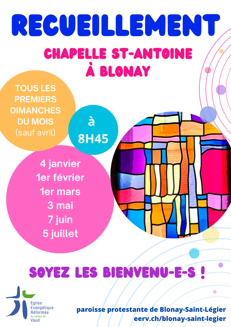 Un culte avec cène sera célébré à la chapelle de Blonay le dimanche 25 janvier 2026, à 8h45, par la pasteure Nicole Rochat.