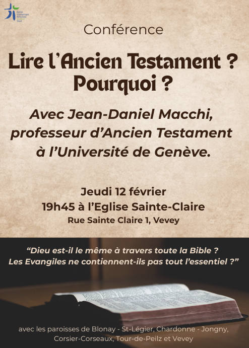 Jeudi 12 février, à 19h45, église Sainte-Claire, rue Sainte-Claire 1, à Vevey. Conférence de Jean-Daniel Macchi, « Lire l’Ancien Testament ? Pourquoi ? ». A découvrir dans le cadre du “Chemin biblique vers Pâques” une série de lectures quotidiennes chez soi et de rencontres pour partager.