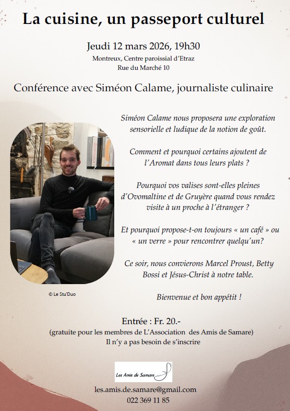 Jeudi 12 mars, à 19h30, au centre paroissial d’Etraz, à Montreux. Conférence avec Siméon Calame, journaliste culinaire « La cuisine, un passeport culturel ». La notion du goût, une exploration sensorielle et ludique : Pourquoi et comment on ajoute de l'Aromat dans nos plats, pourquoi on prend de l'Ovomaltine et du Gruyère pour rendre visite à quelqu'un à l'étranger, pourquoi on propose de prendre un café ou un verre ?