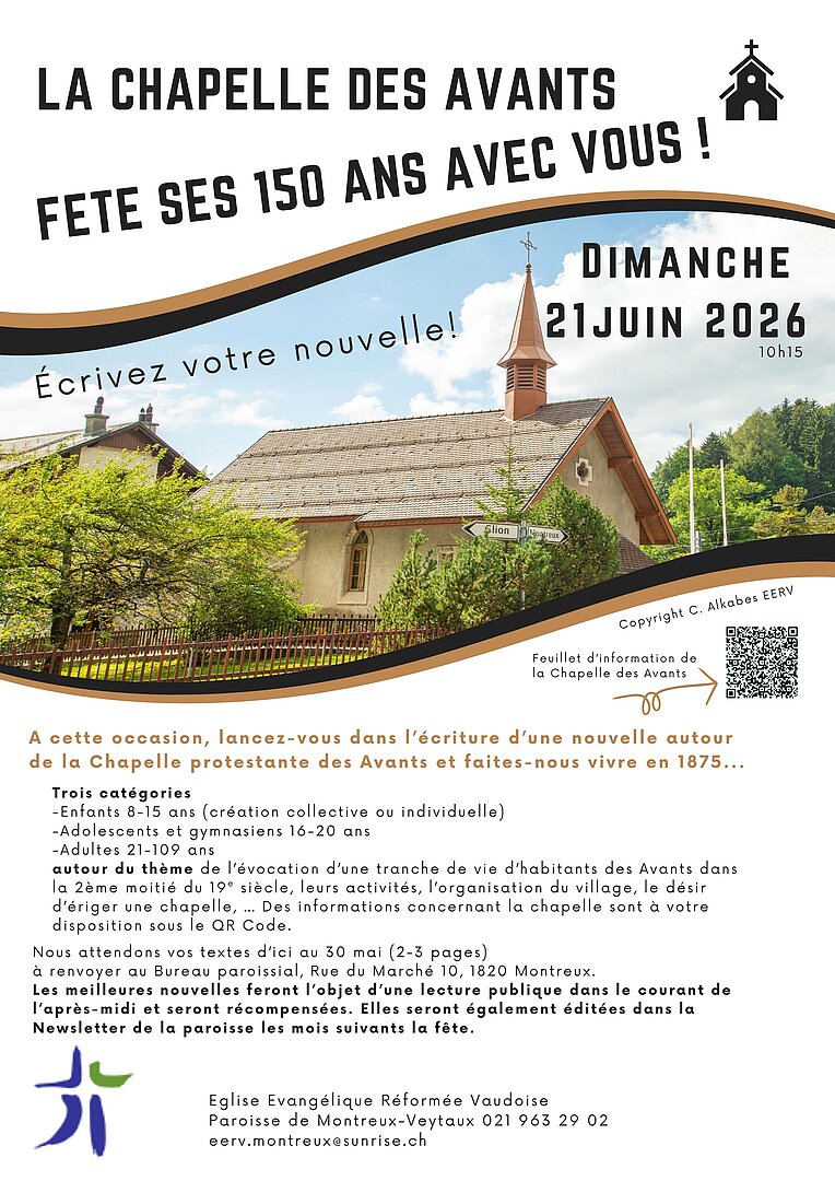 Délai : Nous attendons vos textes d’ici au 30 mai (2-3 pages) à renvoyer au Bureau paroissial, Rue du Marché 10, 1820 Montreux.