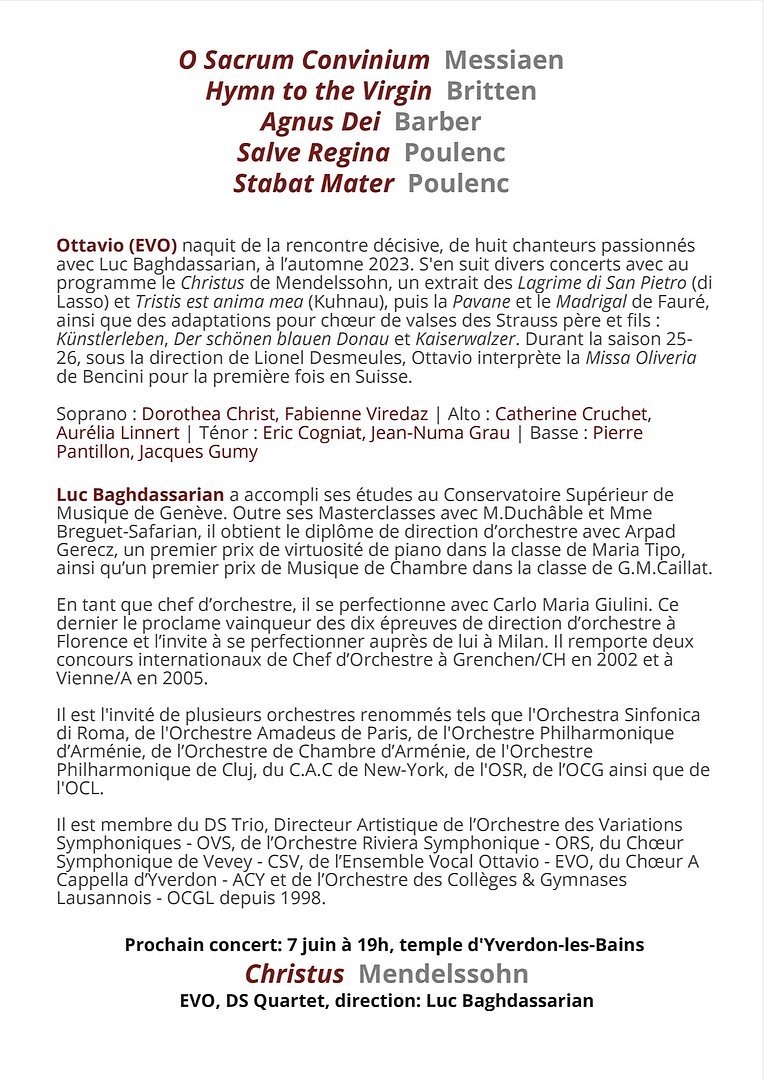 L'Ensemble Vocal Ottavio, dirigé et accompagné au piano par Luc Baghdassarian, vous propose les Stabat Mater et Salve Regina de Poulenc, ainsi que des œuvres de Britten, Barber et Messiaen.