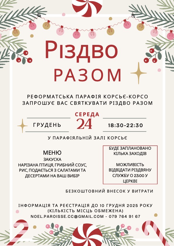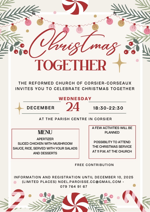 Venez passer Noël avec nous ! Nous mangerons ensemble avec un menu de fête agrémenté par vos salades et desserts ! Quelques animations vous seront proposées. Si vous le souhaitez nous poursuivrons la soirée à 23h au temple de Corsier pour la veillée de Noël.