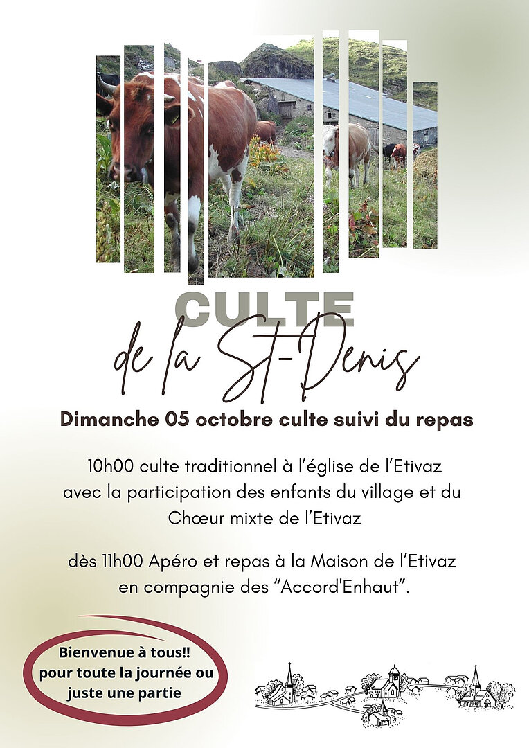 Même si nous ne vivons pas toutes et tous au rythme de la vie du chalet, même si certains parmi nous ont peur des vaches et ne montent jamais sur les pâturages ... La vie de l’alpage est un élément essentiel de notre région. La paroisse du Pays-d’Enhaut fête cette existence-là une fois par année, à l’occasion du culte de la Saint-Denis. Une semaine après la désalpe, nous nous retrouvons à l’église de l’Etivaz et remercions Dieu et la vie pour cette saison passée près des sommets et pour tous les fruits du travail des armaillis et de leur famille.