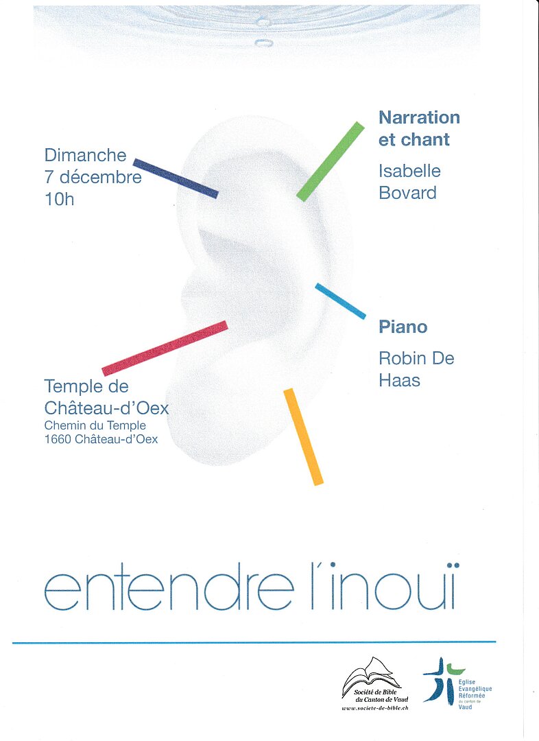 Entendre l’inouï, c’est environ une heure de narrations bibliques, entremêlées de chansons francophones. Le fil rouge entre les récits est inspiré de la lecture du livre de Dominique Collin, « L’Evangile inouï » (éd. Salvator, 2019). Cette présentation est destinée aux adultes, mais est accessible dès 10 ans.