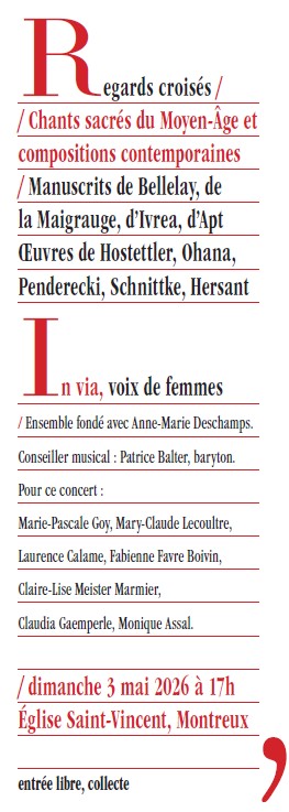 Dimanche 3 mai, à 17h, au temple Saint-Vincent, à Montreux. Concert In via, regards croisés, chants sacrés du Moyen-âge et compositions contemporaines par In Via, voix de femmes. Entrée libre, collecte.
