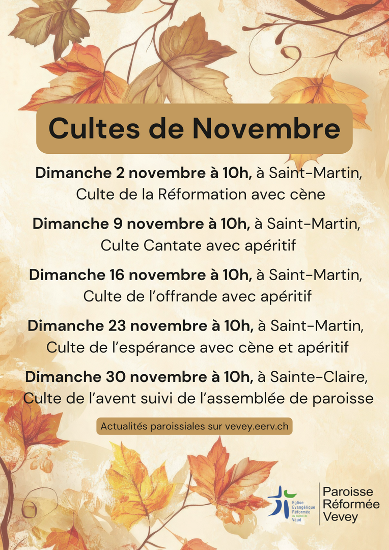 9 Novembre 10h à Saint-Martin - Culte et cantate. Cantate BWV 38 de Bach "Aus tiefer Not schrei'ich zu dir". Direction Dorothea Christ et Daniel Chappuis à l'orgue. Culte suivi d'un apéritif
